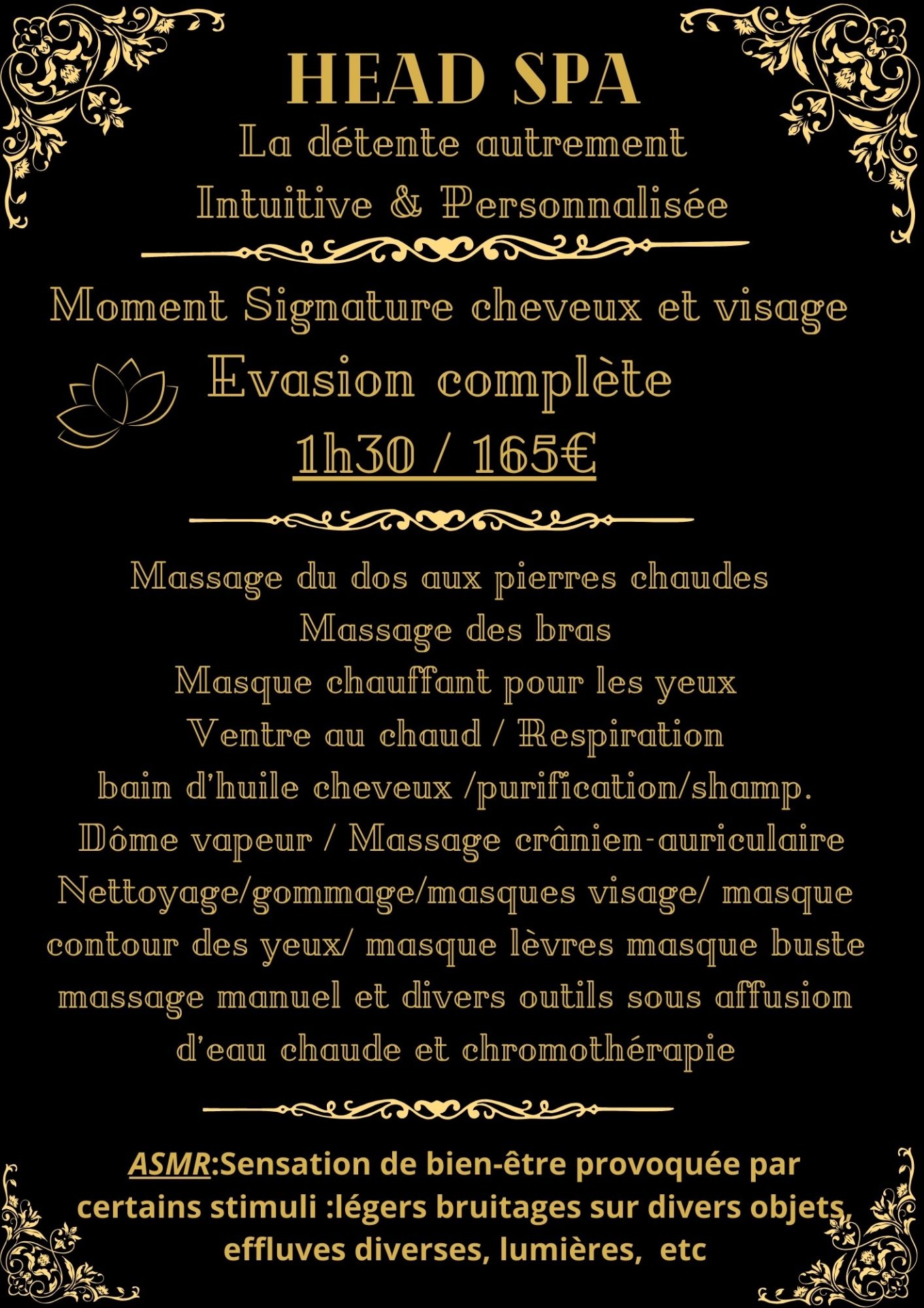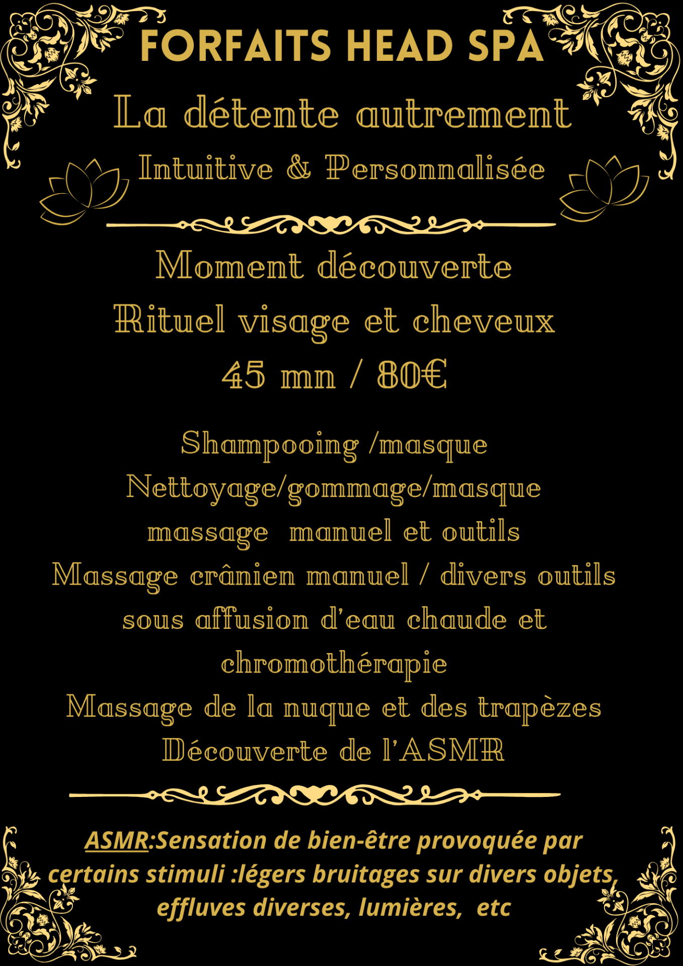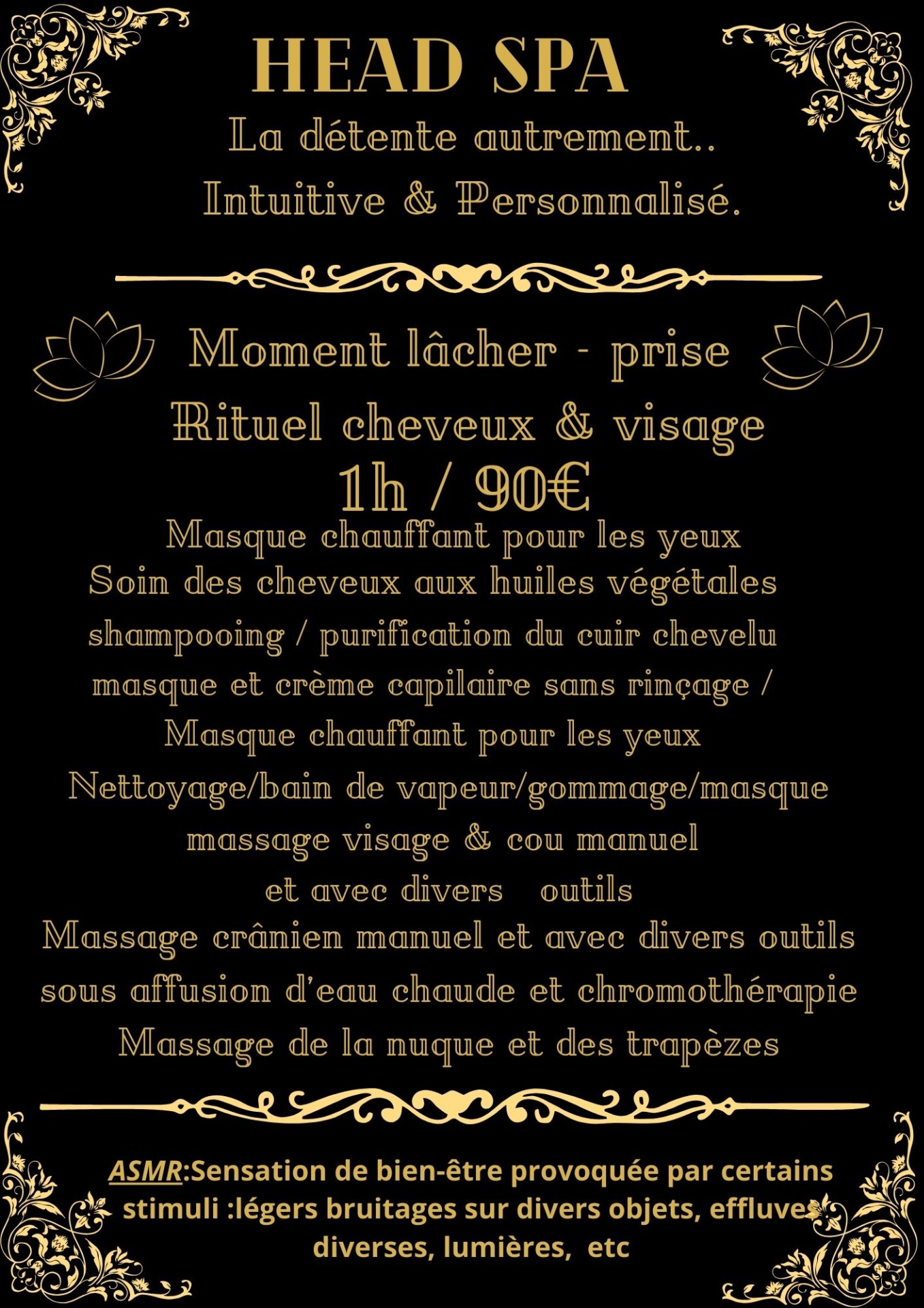 Tout comme mes massages Signature, les prestations Head spa et Feet spa sont aussi Intuitives et personnalisées: les massages crâniens et plantaires cibleront vos besoins: mâchoires contractées, maux de tête, migraines , jambes lourdes, chevilles gonflées etc. Chacun de vos moments est unique !
