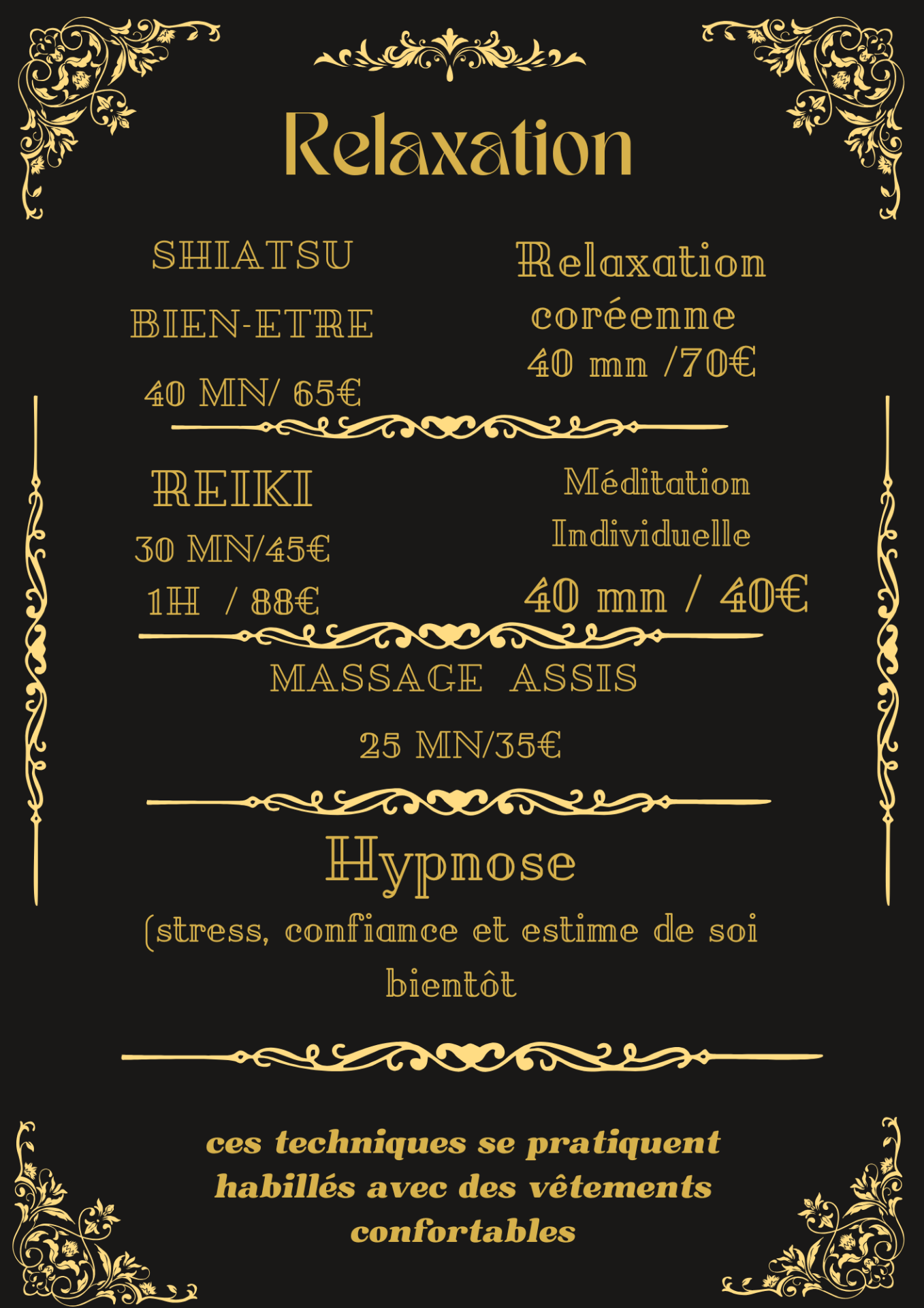 Ces méthodes vous apportent une détente profonde, tout en restant habillé-e. C'est une bonne alternative si vous n'aimez le toucher à même la peau.Certaines d'entre elles sont intégrées à votre massage selon vos besoin ( relaxation coréenne, shiatsu, respiration)