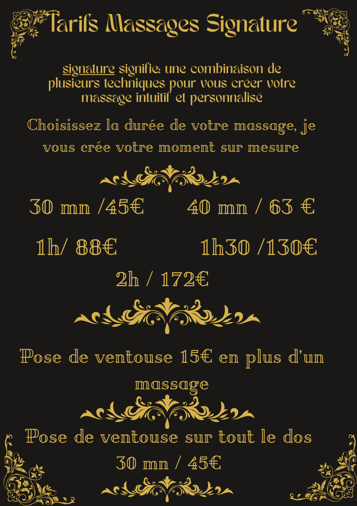 Votre massage Signature est sur mesure, il correspond à vos besoins, à votre physique, à votre façon d'être, à votre sensibilité, à "votre état" le jour du rdv.